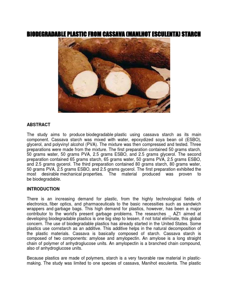 . Cassava starch was mixed with water epoxydized soya bean oil ESBO glycerol and polyvinyl alcohol PVA. View 125449131-Investigatory-Project-Biodegradable-Plastic-From-Cassavadocx from ACCOUNTING 111 at Mindanao State University - Iligan Institute of Technology. Starch is a natural organic polymer manufactured by.